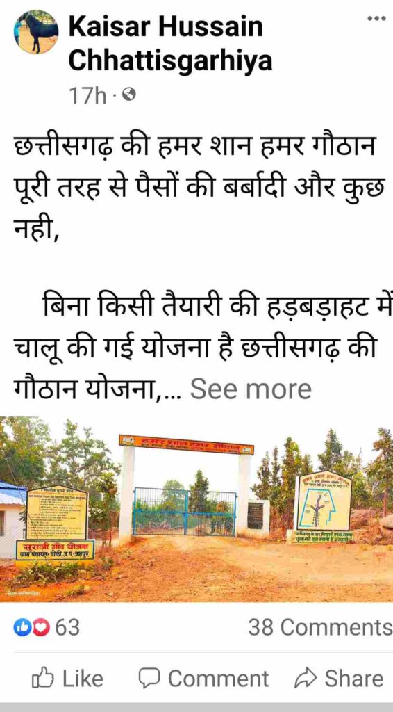 केसर ने एक गोठान की तस्वीर के साथ अपने फेसबुक वॉल में लिखा है—-“छत्तीसगढ़ की हमर शान हमर गौठान पूरी तरह से पैसों की बर्बादी और कुछ नही,