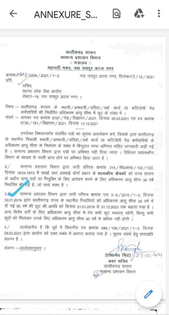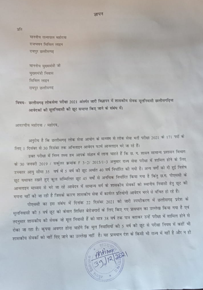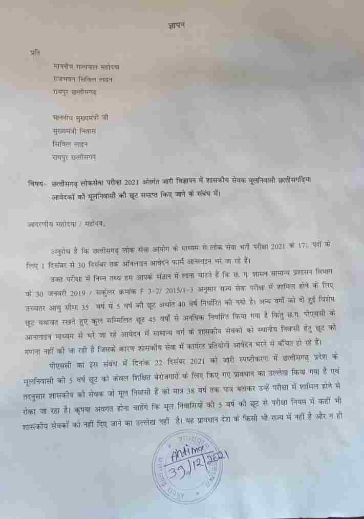 मालूम हो कि सामान्य प्रशासन विभाग के सर्कुलर f-3-2/ 2015/ 1-3 नया रायपुर दिनांक 30-1- 2019 के अनुसार राज्य के मूल निवासियों के लिए 35 वर्ष में 5 वर्ष की छूट है जिसे शासकीय सेवकों के लिए जो छत्तीसगढ़ के मूल निवासी हैं उनको रोजगार प्राप्त हो जाने के कारण छ ग पीएससी के द्वारा आवेदन रिजेक्ट किया जा रहा है। छत्तीसगढ़ पीएससी के अनुसार एक बार नौकरी में आने के बाद 38 वर्ष की आयु उम्र में ही सारे अवसर समाप्त हो जाते हैं जबकि राज्य में व्यापम के द्वारा मंडी निरीक्षक सहायक संपरिक्षक ,ज्येष्ठ संपरिक्षक विभिन्न जिलों में न्यायालय द्वारा की जा रही भर्ती में सामान्य प्रशासन विभाग के 30-1- 2019 के सर्कुलर के अनुसार ही उच्चतर आयु सीमा में 5 वर्ष जोड़कर शासकीय सेवक को मिलने वाली 3 वर्ष के अतिरिक्त छूट के साथ तिरालिस वर्ष की उच्च आयु तक शामिल होने का अवसर मिल रहा है।