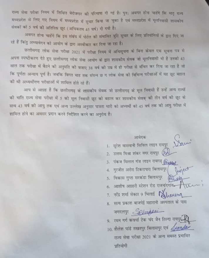 प्रतियोगी संघ के सुरेश वासवानी, रमन गर्ग, शैलेश पांडे ,उत्तम मिश्रा, भूपेश ठाकुर ने कहा व्यापम व विभागीय एजेंसियों द्वारा ली जा रही परीक्षाओं में छत्तीसगढ़ शासन के समान प्रशासन के सर्कुलर के अनुसार ही 43 वर्ष तक की छूट राज्य के मूल निवासी शासकीय सेवक तो सामान्य वर्ग के हैं उन्हें मिलती है लेकिन सीजीपीएससी द्वारा आवेदन नहीं लिया जा रहा है ,पी एस सी सचिव ने पहले सुधार का हवाला दिया गया, अब मनमानी की जा रही है। जी ए डी और राज्य सरकार को भी इस ओर होश नहीं है कि लोक सेवा आयोग को स्पष्ट रूप से बता दिया जाए, जब देश के अन्य राज्यों में यह प्रावधान नहीं है तो छत्तीसगढ़ में छत्तीसगढ़ के निवासियों के साथ हितों कुठाराघात क्यों किया जा रहा है। इसमें तत्काल सुधार होना चाहिए। आरंभिक परीक्षा की तिथि आवेदन को आगे बढ़ाया जाना चाहिए एवं मुख्यमंत्री जी को चाहिए कि वह 2 साल कोरोना महामारी के कारण विद्यार्थियों के तैयारी में हुई बाधाओं को देखते हुए, राज्य के सभी निवासियों को राज्य सेवा परीक्षा में 2 वर्ष की अतिरिक्त छूट अलग से प्रदान करें।अनेक लोग ऐसे हैं जो पीछे 2 वर्षों से महामारी के कारण प्रत्यक्ष अप्रत्यक्ष रूप से प्रभावी होने के कारण परीक्षा नहीं दे पाए या एग्जाम की तैयारी ठीक से नहीं कर पाए। लेकिन इसके उलट युवाओं को परीक्षा में बैठने से वंचित किया जा रहा है।प्रतिभागियों ने बताया कि
