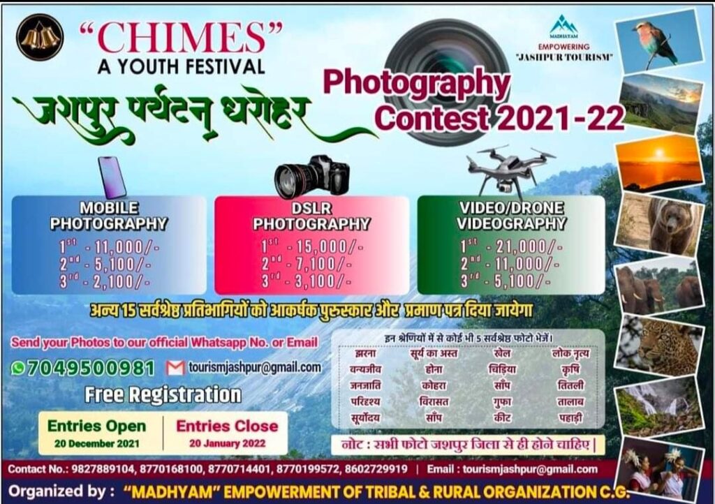 जशपुर (वायरलेस न्यूज़) जशपुर पर्यटन को बढ़ावा देने हेतु आयोजित फोटो ग्राफी प्रतियोगिता हेतु माध्यम एमपावरमेंट ऑफ़ ट्राइबल एंड रूरल ऑर्गनाइजेशन कुनकुरी इकाई द्वारा जशपुर जिले के विभिन्न क्षेत्रों के पर्यटन स्थलों को बढ़ावा देने एवं पर्यटकों को पर्यटन के क्षेत्र में आकर्षित करने हेतु CHIMES ” A YOUTH FESTIVAL जशपुर पर्यटन धरोहर के तहत मोबाइल फोटोग्राफी, डीएसलआर, ड्रोन विडिओग्रॉफी कि प्रतियोगिता कराई जा रही हैँ यह प्महाविद्यालयीन एवं स्कूल स्तर छात्र – छात्राओं के लिए भी फोटोग्राफी प्रतियोगिता का आयोजन है जो कि 20 जनवरी 2022 तक किया जा रहा है ।जिसमें अधिक से अधिक छात्र छात्राओं को सम्मिलित होकर अपने आस पास के फोटोग्राफी कर ऑनलाइन सम्मिलित करना है। प्रतियोगिता में प्रतिभागी द्वारा खींची गई फोटो व शूट किये गए वीडियो नेचुरल व ओरिजनल होंगे।