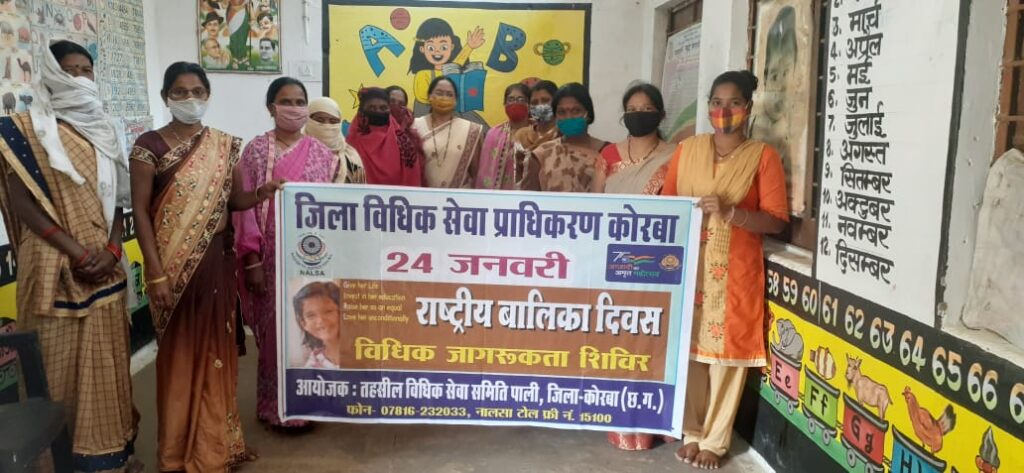 प्राधिकरण कोरबा के निर्देश पर तालुक विधिक सेवा समिति पाली के अध्यक्ष श्वेता मिश्रा मजिस्ट्रेट पाली के आदेश पर दिनांक 24/1/22 को राष्ट्रीय बालिका दिवस के अवसर पर corona महामारी की गाइड लाइन का पालन करते हुए विधिक जागरूकता शिविर आयोजित की गई। ता. वि.से. स.पाली पाली के आदेशानुसार P.L.V प्रतीक्षा शर्मा एवं वचन मानिकपुरी के द्वारा राष्ट्रीय बालिका दिवस के अवसर पर भारतीय समाज में लड़कियों के सामने आने वाली असमानताओं के बारे में जन जागरूकता फैलाने के बारे में जानकारी दी गई। लड़कियों के लिए स्वस्थ और सुरक्षित वातावरण के निर्माण के बारे में एवं एक उज्जवल भविष्य के लिए लड़कियों का सशक्तिकरण विषय के साथ जागरूकता अभियान शास. हा.स्कूल पाली एवम् आंगन बाड़ी केंद्र पाली में covid-19 के दिशा निर्देशों का पालन करते हुए विधिक जागरूकता शिविर आयोजित किया गया। इस दिन को बालिका बचाओ , बाल लिंग अनुपात, बाल विवाह, और दहेज जैसी सामाजिक कुरीतियों के बारे में लोगों को जागरूक करने के उद्देश्य से विधिक जागरूकता शिविर आयोजित किया गया जिसमें लगभग 40-45 महिलाएं एवं बच्चे उपस्थित रहे।