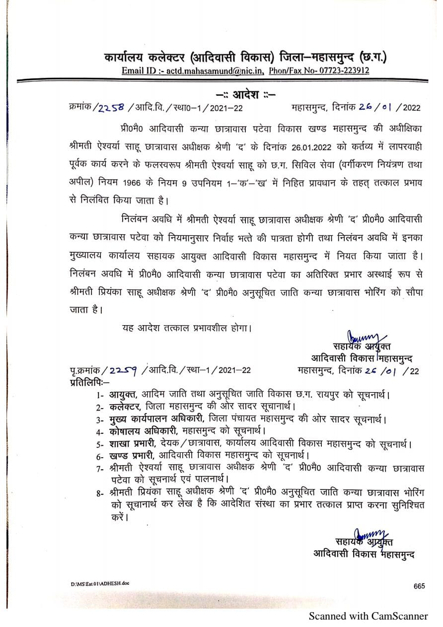 महासमुंद कलेक्टर निलेशकुमार क्षीरसागर ने महासमुंद ज़िले के पटेवा कन्या हॉस्टल में छात्राओं से झंडा उतवाने के दौरान करंट लगने से एक छात्रा की मृत्यु होने पर हॉस्टल की अधीक्षिका ऐश्वर्या साहू को तत्काल निलंबित कर दिया गया है । कलेक्टर ने दुर्घटना के जाँच के आदेश दिए है । करंट लगने से घायल एक छात्रा के बेहतर उपचार के निर्देश दिए है । उन्होंने आरबीसी 6-4 छात्र दुर्घटना के तहत प्रकरण तैयार कर आर्थिक सहायता राशि मुहैया कराने के निर्देश भी दिए ।