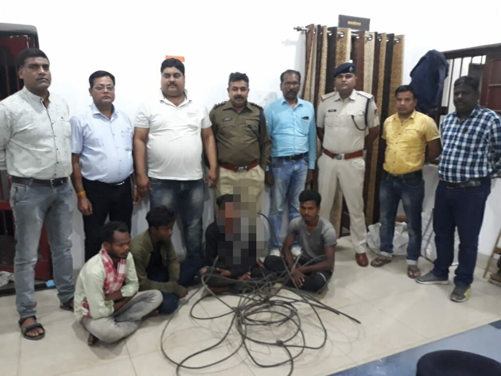 आरोपियों को गिरफ्तार किया गया है वही रेल्वे की चोरी की तार को खरीदने वाला खरीददार फरार हो गया है। रायगढ़ आरपीएफ पोस्ट प्रभारी निरीक्षक राजेश वर्मा ने बताया कि मामले की सूचना हमे 26 फरवरी की सुबह को लगी कोतरलिया जामगांव सेक्शन के खम्बा नम्बर 573/16/20 के पास कि चोरों के गिरोह ने हाईटेंशन तार ओएचई एन्टी क्रिप वायर जिसमे 25 हजार वोल्ट का करेंट रहता है जिसे 25 फरवरी की दरमियानी रात को काट कर ले गए है प्रधान मुख्य सुरक्षा आयुक्त ए एन सिंहा एवं वरिष्ठ मंडल सुरक्षा आयुक्त ऋषि कुमार शुक्ला बिलासपुर के मार्गदर्शन और निर्देशो का पालन करते हुए आसपास के गांवों में बिलासपुर आरपीएफ सूचना आ अपराध शाखा से आये बल के साथ घटनास्थल से चोरी हुए तारो की पतासाजी के लिए टीम आसपास के गांवों में खोजबीन करती रही । मुखबिरों ने सूचना दी कि ग्राम भोजपल्ली के दस लोग चोरी की इस घटना को अंजाम दिए है ।फिर क्या आरपीएफ रायगढ और बिलासपुर की टीम सक्रिय हो गई और छापामार शैली में आरोपियों की धरपकड़ में लग गई। दो दिन गावो में भटकने के बाद टीम को अच्छे परिणाम मेहनत करने से मिलने लगे। चोरी के माल सहित आरोपियों को पकड़ने के लिए टीम ने बताये गए नामों को अपने सर्विलांस में रखा और भोजपल्ली गांवों के एक अपचारी बालक सहित चार चोरों लखन किसान वल्द हरिश्चंद्र19 वर्ष डिपापारा, नीलांचल किसान वल्द घुरुऊ किसान 18 वर्ष,सोनू खड़िया वल्द वासुदेव खड़िया उम्र 18 वर्ष,राधेश्याम किसान 35 वर्ष सभी निवासी भोजपल्ली पोस्ट लोइग थाना चक्रधनगर नगर को रायगढ को गिरफ्तार कर आरपीएफ पोस्ट रायगढ लाया गया पूछताछ में 47 मीटर वायर कीमत 24000 को चोरी करना बताया जिसमे से इन सभी के कब्जे से 25.5मीटर वायर कीमत 13हजार को आरपीएफ टीम ने इन चोरों से जप्त किया इसके अलावा इन चोरों ने 5 और साथियों को चोरी की इस वारदात में शामिल होना बताया था जांच का दायरा बढ़ते ही पूछताछ में आरोपियों ने 10 नाम और लालटंकी रोड स्थित एक बर्तन दुकान में तार को बेचना बताया 3 मार्च को आरपीएफ टीम टास्क टीम वन , डिटेक्टिव टीम ने मिलकर कोतरलिया जामगांव सेक्शन में ईड सिनर्जी के पास चार अन्य को गिरफ्तार करने में कामयाबी हासिल की इन आरोपियों से पूछताछ करने पर तांबा के तार केटनरी एंटी क्रीप वायर खंबे में चढ़ कर काटे थे । उक्त माल को रायगढ के पूरणमल जनकराम नामक बर्तन दुकान में तांबा के तार को 6000 में बेचे थे।आरोपी राजेश भुइहर, उम्र 23 वर्ष दिनेश किसान21 वर्ष,अखिलेश गुप्ता,24 वर्ष सभी निवासी ग्राम विश्वनाथपाली थाना चक्रधर नगर को गिरफ्तार कर इन आरोपियों की निशान देही पर पूरनमल जनकराम बर्तन दुकान से22 किलोग्राम केटनरी वायर जप्त किया गया एवं उसके नौकर को गिरफ्तार किया गया दुकान संचालक नितेश अग्रवाल मोके से फरार होने में काम