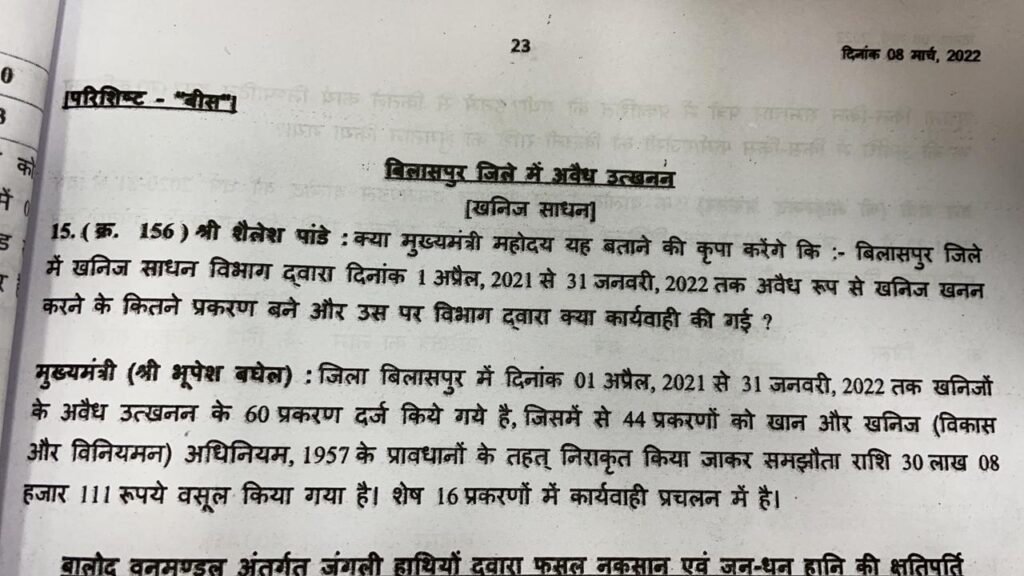 रायपुर (वायरलेस न्यूज़ ) बिलासपुर के विधायक शैलेष पांडेय द्वारा विधानसभा में खनिज विभाग द्वारा अवैध उत्खनन और कार्रवाई को लेकर किए गए प्रश्न का जवाब देते हुए मुख्यमंत्री भूपेश बघेल ने बताया कि जिला बिलासपुर में 1अप्रैल 21से 31 जनवरी 22 तक खनिजों के