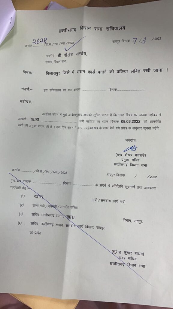 विधायक शैलेष पांडेय ने बिलासपुर में राशन कार्ड बनाने में किए जा रहे विलंब को लेकर भी ध्यानाकर्षण प्रश्न पूछा है और बताया है कि बिलासपुर जिले के अंतर्गत खाद्य विभाग द्वारा विभिन्न हितग्राहियों का बड़ी संख्या में राशन कार्ड बनाया गया है परंतु वर्तमान में लोगों के द्वारा आवेदन पत्र जमा करने के बाद भी संबंधित अधिकारियों के द्वारा अनावश्यक रूप से राशन कार्ड बनाने एवं नाम जोड़ने व काटने की प्रक्रिया लंबित रखी जा रही है शासन की महत्वपूर्ण योजना खूबचंद बघेल स्वास्थ्य योजना एवं मुख्यमंत्री विशेष सहायता योजना अंतर्गत निशुल्क इलाज में राशन कार्ड की आवश्यकता पड़ती है ।विभाग एवं जिला अधिकारियों का रवैया एवं आवेदन लंबित रखने के कारण लोगों को अनावश्यक परेशानी का सामना करना पड़ता है जिससे जनता में अत्याधिक रोष व्याप्त है। विधायक शैलेश पांडेय द्वारा राशन कार्ड बनाने के संबंध में पूछे गए प्रश्न का खाद्य मंत्री आज 8 जुलाई को सदन में जवाब देंगे।