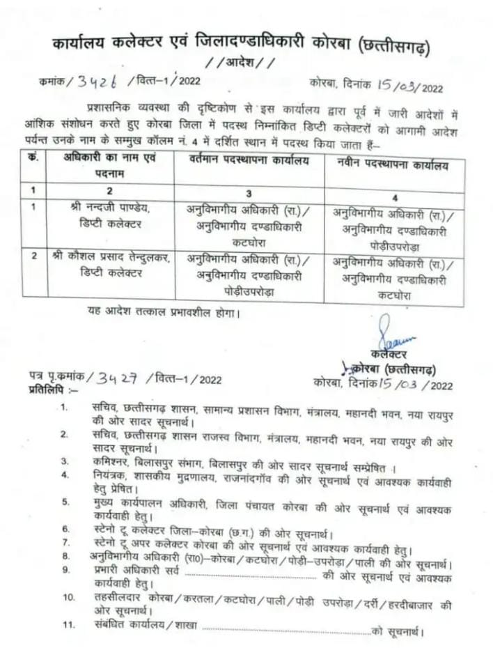 पुष्पेन्द्र कोरबा: जिले में जिला कलेक्टर ने आदेश जारी करते हुए कटघोरा अनुविभागीय अधिकारी (राजस्व) नंद जी पांडेय को पोंडी उपरोड़ा अनुविभाग में पदस्थ किया गया है।
