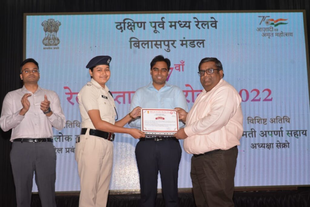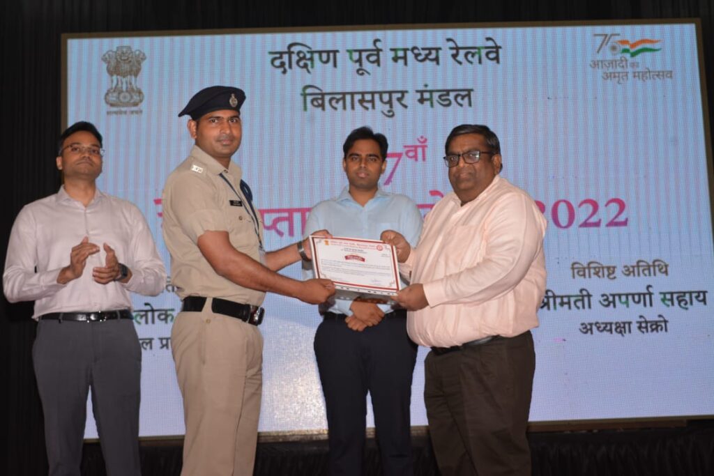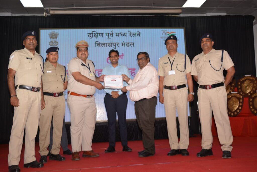 मुख्य कार्यालय अधीक्षक बिलासपुर, बीरभान सिंह कनिस्ट लिपिक बिलासपुर,सत्यम सरकार आरक्षक चांपा पोस्ट, माधो प्रसाद हे.का. रायगढ़ पोस्ट,महिलाआरक्षक सीता अग्रवाल बिलासपुर पोस्ट तथा TOPB टास्क टीम-1 उप निरीक्षक आर एस मिश्रा तथा उनके टीम को DRM पुरस्कार से पुरस्कृत किया गया ,इसी क्रम में DRM बिलासपुर महोदय द्वारा वरिष्ठ मंडल सुरक्षा आयुक्त रेलवे सुरक्षा बल बिलासपुर श्री ऋषि कुमार शुक्ला की उपस्थिति में बेस्ट आरपीएफ पोस्ट हेतु रेलवे सुरक्षा बल पोस्ट बिलासपुर को नामित करते हुए श्री भास्कर सोनी निरीक्षक रेलवे सुरक्षा बल बिलासपुर तथा उनकी टीम को सुरक्षा शील्ड से पुरस्कृत किया गया उपरोक्त पुरस्कार से रेलवे सुरक्षा बल बिलासपुर मंडल की टीम अति उत्साहित है