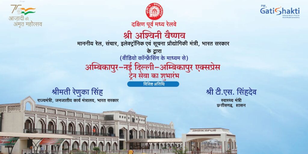 बिलासपुर (अमित मिश्रा वायरलेस न्यूज़) केंद्रीय रेल मंत्री अश्वनी वैष्णव भारत सरकार के द्वारा वीडियो कांफ्रेंसिंग के माध्यम से 14 मई 22 को अम्बिकापुर -नई दिल्ली अम्बिकापुर एक्सप्रेस ट्रेन सेवा का शुभारंभ किया जाएगा ।
