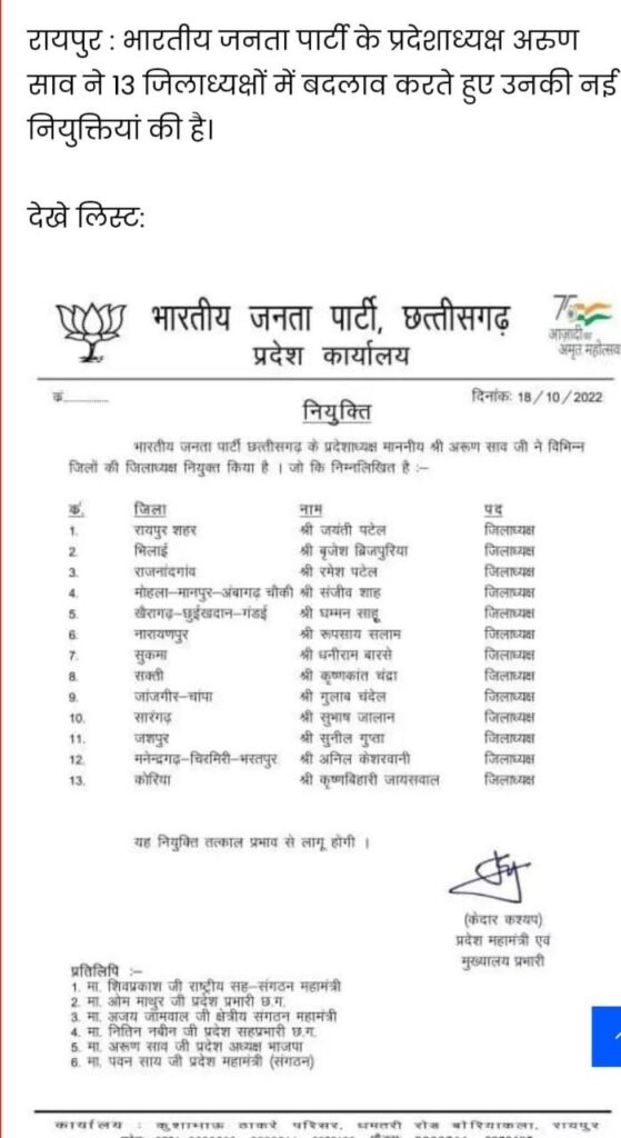 रायपुर : (वायरलेस न्यूज) दो दिन पहले ही वायरलेस न्यूज ने खबर दी थी की प्रदेश भाजपा छत्तीसगढ़ में 20जिला अध्यक्षों को दिपावली पूर्व बदलने जा रही है और ठीक आज प्रदेश भाजपा के अध्यक्ष अरुण साव ने 13 जिला भाजपा अध्यक्ष को बदल दिया है।