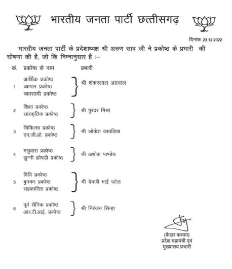 रायपुर (वायरलेस न्यूज) आज प्रदेश भाजपा अध्यक्ष अरूण साव ने प्रदेश प्रभारी ने 6 प्रकोष्ठ प्रभारियों की घोषणा कर दी है।सूची देखें किनको क्या मिला