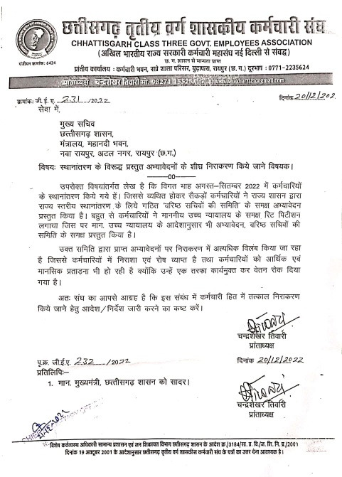 छत्तीसगढ़ तृतीय वर्ग शासकीय कर्मचारी संघ (पं. क्र. 6424) के प्रांताध्यक्ष चंद्रशेखर तिवारी ने मुख्य सचिव, छत्तीसगढ़ शासन को पत्र लिखकर कर्मचारियों द्वारा स्थानांतरण के विरुद्ध प्रस्तुत अभ्यावेदनों के त्वरित निराकरण किये जाने की मांग कि है ।