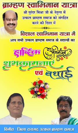जिलाध्यक्ष अरुण पंडा ने उत्कल ब्राह्मणों से अपील किया है कि परस्पर प्रेम और सौहार्द्र का वातावरण निर्मित होने वाले उद्देश्यपूर्ण कार्यक्रम जो पुरन्दर मिश्रा के नेतृत्व में 24 व 25 जून को स्वाभिमान यात्रा के रूप में निकल रही है उस यात्रा में रायपुर,महासमुंद, पिथौरा, बसना, सराईपाली, सारंगढ़, बरमकेला, सरिया, पुसौर, रायगढ़ घरघोड़ा, तमनार, लैलूंगा तहसील सहित जशपुर जिला के समस्त ब्राह्मण बन्धु उक्त कार्यक्रम में सपरिवार पधारकर छत्तीसगढ़ के उत्कल ब्राह्मणों को संगठित करने के इस प्रयास को सफल बनावें।