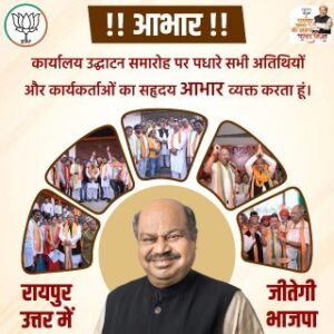 बताते चलें कि रायपुर के सिटी सेंटर मॉल के सामने, एक्सप्रेस हाईवे ढालान, पुराना बस स्टैंड के पास पंडरी स्थित छत्तीसगढ़ वॉच कांप्लेक्स में भाजपा प्रत्याशी पुरंदर मिश्रा का मुख्य चुनाव कार्यालय खोला गया है। कार्यालय के उद्घाटन अवसर पर उत्तर विधानसभा क्षेत्र के लोगों की जोरदार भीड़ उमड़ी।