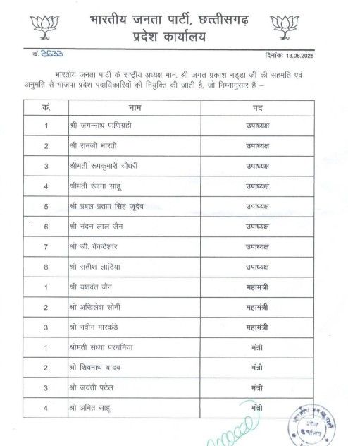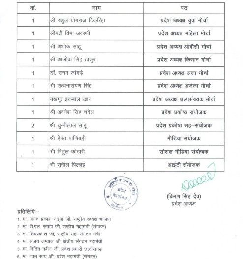 रायपुर। ( वायरलेस न्यूज़) भारतीय जनता पार्टी प्रदेश अध्यक्ष किरण सिंहदेव की नई टीम का ऐलान हो गया है। नई टीम में नए चेहरों को स्थान दिया गया है। देखें सूची…