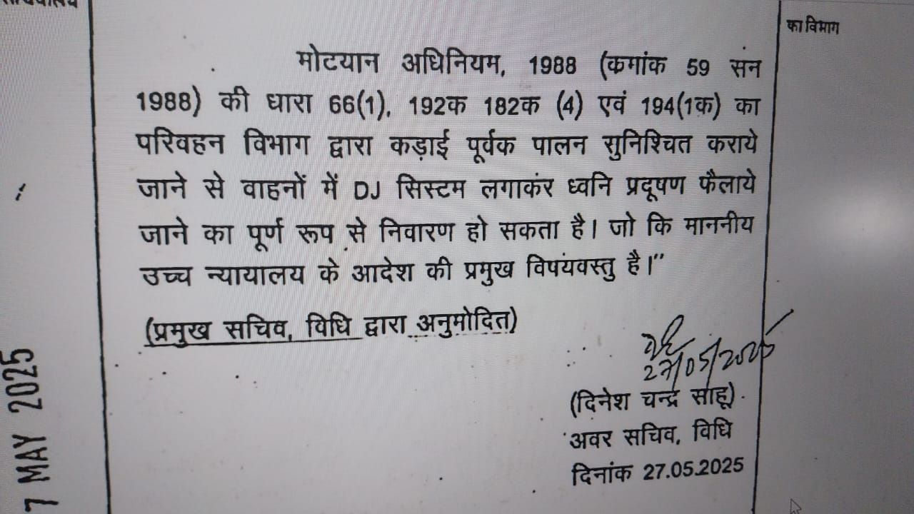 छत्तीसगढ़ शासन द्वारा केंद्र के कानून और छत्तीसगढ़ के नियम का अध्ययन करने के लिए और संशोधन प्रस्तावित करने के लिए गठित समिति को वोधी विभाग ने कहा है कि मोटरयान अधिनियम 1988 की धारा 66 (1), 192 (क), 182 क (4), 194 (1क) का परिवहन विभाग द्वारा कढ़ाई पूर्वक पालन सुनिश्चित कराए जाने से वाहनों में डीजे सिस्टम लगाकर ध्वनि प्रदूषण फैलाए जाने का पूर्ण रूप से निवारण हो सकता है।