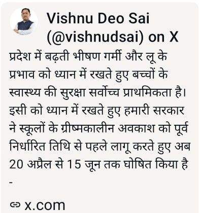 मुख्यमंत्री श्री विष्णु देव साय ने कहा कि बढ़ती भीषण गर्मी में बच्चों की सेहत की सुरक्षा हर हाल में सुनिश्चित करना हम सब की जिम्मेदारी है। बच्चों के स्वास्थ्य और सुरक्षा को ध्यान में रखते हुए पूर्व निर्धारित ग्रीष्मकालीन अवकाश को पहले लागू करने का निर्णय लिया है, ताकि इस भीषण गर्मी में बच्चों की सेहत सुरक्षित रह सके।